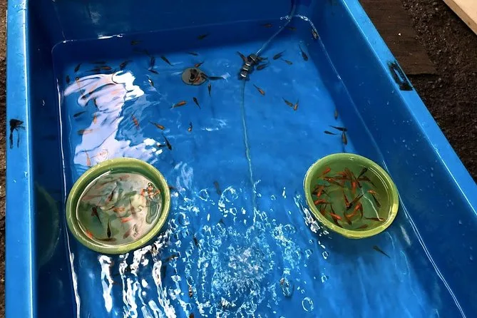 La última parada fue Kingyoda, justo a las afueras del pueblo—un enorme centro de producción de peces dorados. Nunca había visto tantos peces dorados juntos: los estanques se extienden hasta donde alcanza la vista, brillando en rojo y blanco bajo el sol. El museo contiguo tiene acuarios con razas raras (algunas con mejillas tan infladas que parecen irreales) y carteles antiguos sobre la historia de la cría de peces dorados. Incluso hay un espacio donde puedes intentar atrapar peces tú mismo—¡es más difícil de lo que parece! Al final del tour, mi carrete de fotos estaba lleno de imágenes de peces y del castillo que ni siquiera había planeado tomar.