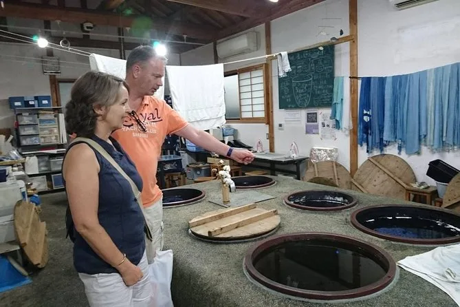 Luego entramos en una antigua casa de tintorero de índigo. El interior huele ligeramente a tinte y madera vieja, con un aroma terroso. Aquí se esconde un pequeño museo con redes antiguas para peces dorados y algunas estampas curiosas de la era Edo que muestran competencias de peces dorados (¿quién lo hubiera imaginado?). Compré un llavero teñido a mano como recuerdo; todos son obra de artistas locales.