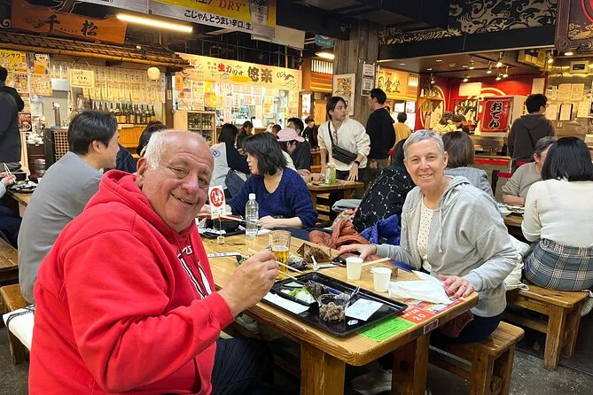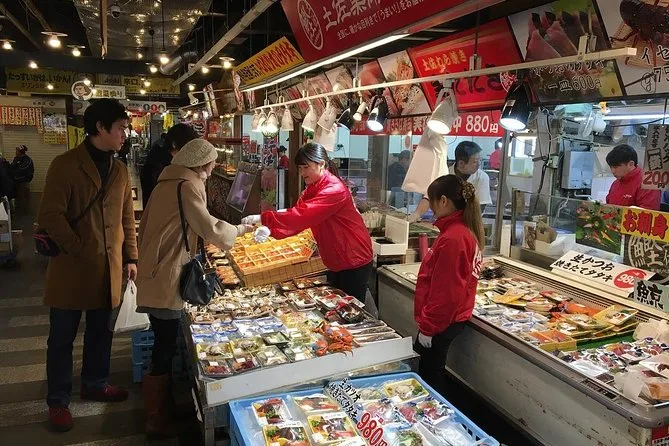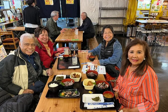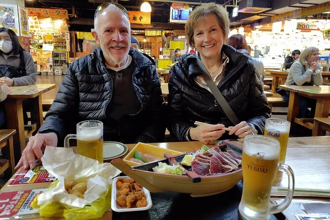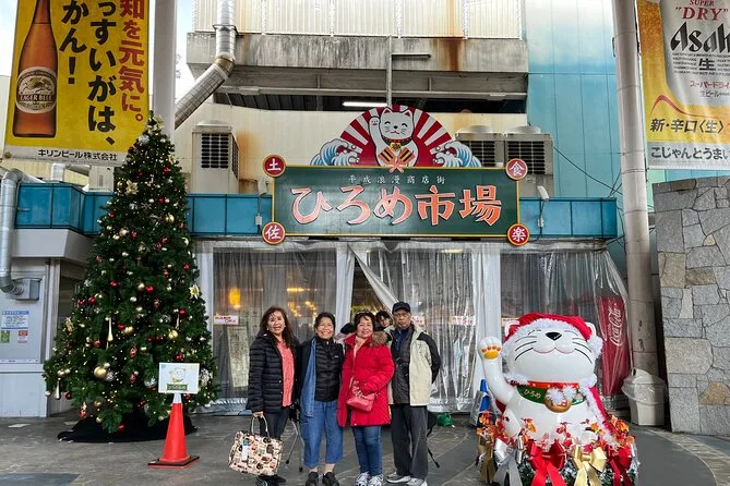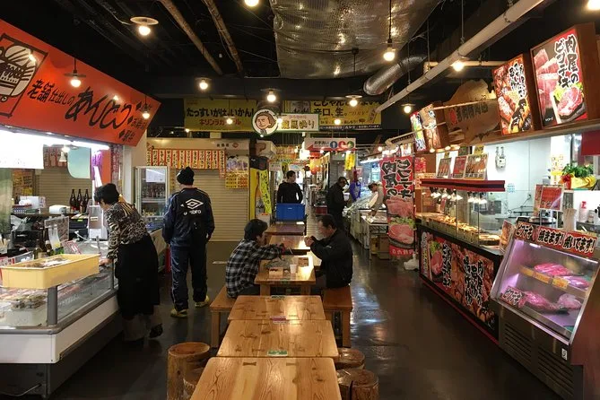 La comida fue en el Mercado Hirome, que honestamente se sentía como entrar en una reunión familiar ajena—ruidoso, cálido, todos moviendo los palillos con energía. Encontramos un lugar junto a una pareja mayor que asaba katsuo tataki (bonito a la plancha) y nos enseñaron a espolvorear sal y ajo antes de comerlo. Todavía recuerdo ese sabor ahumado días después. Había tantos puestos que me perdí un par de veces tratando de volver al baño (Yuki se rió mucho). Si buscas algo elegante o pulido, este no es el sitio—pero si quieres vida real y risas que rebotan en mesas de metal, entonces sí…