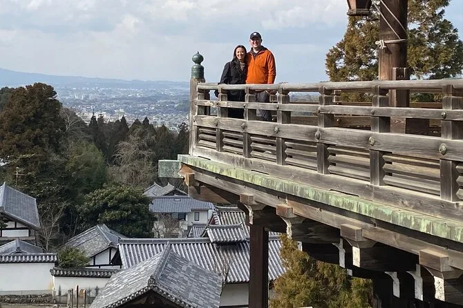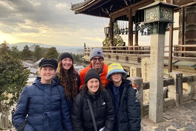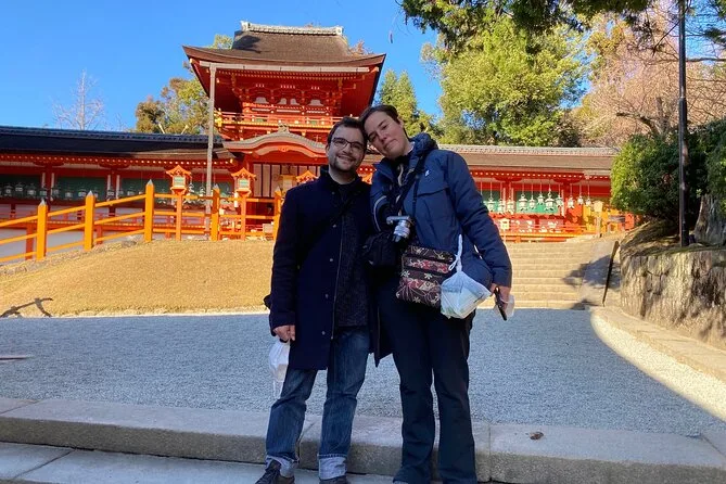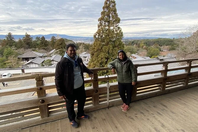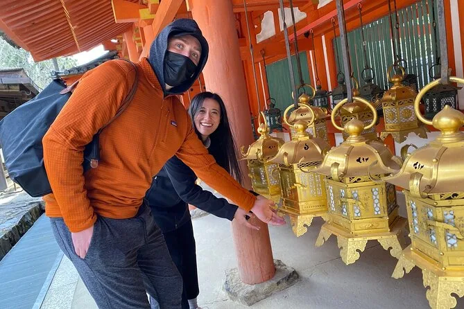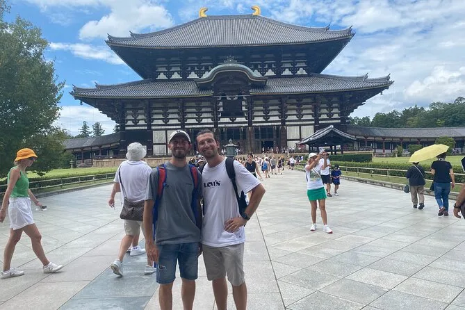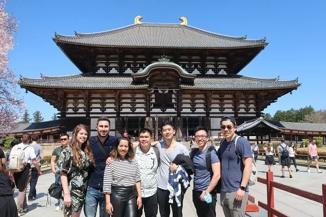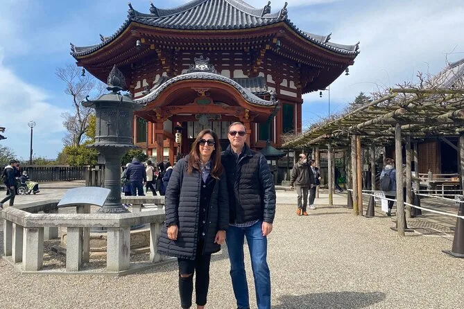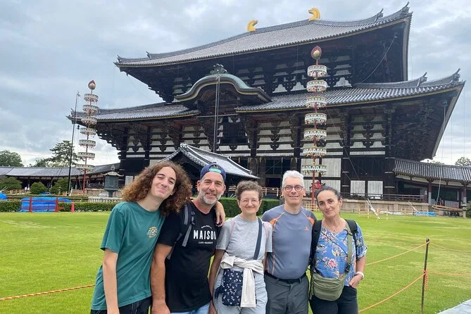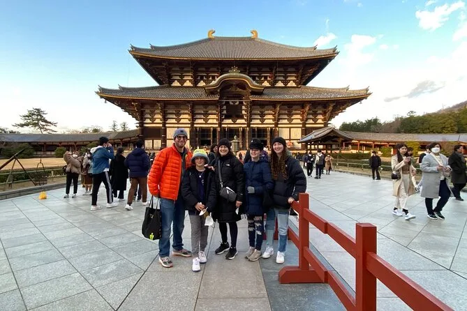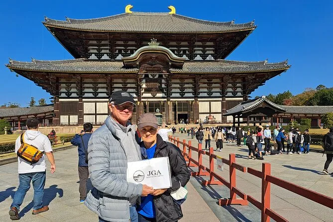 Tu día incluye encuentro con un guía local certificado a pie en el centro de Nara, un itinerario a pie totalmente personalizable con 3–4 sitios principales (como Todai-ji o Jardín Yoshikien), además de historias y datos interesantes en el camino—las entradas y comidas no están incluidas, pero te damos consejos en cada parada.