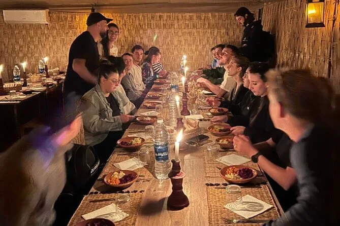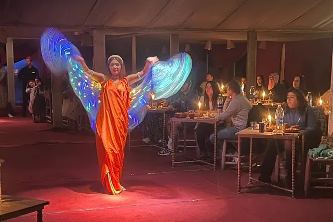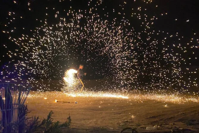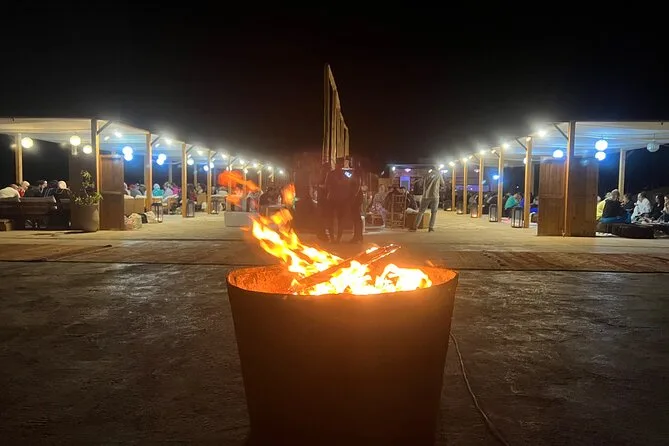 La noche incluye música en vivo de Gnaoua, bailes tradicionales, tragafuegos y un ambiente junto a la fogata.
