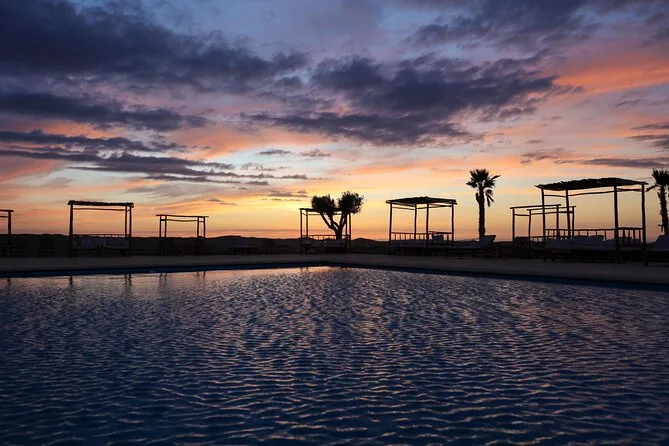 Tu día incluye transporte con aire acondicionado y recogida y regreso al hotel en Marrakech, acceso a una refrescante piscina en el desierto para nadar o relajarte al llegar, todo el equipo de seguridad para una hora de paseo en quad guiado por un instructor por el terreno rocoso de Agafay, un paseo en camello con vestimenta tradicional azul (con ayuda de guías locales), agua embotellada y té marroquí durante la noche, además de una cena marroquí de cinco platos servida bajo lonas mientras disfrutas de música en vivo de Gnaoua, bailes y espectáculos de tragafuegos alrededor de la fogata antes de regresar tarde en la noche.
