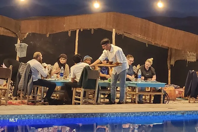 Tu día incluye transporte con aire acondicionado y recogida y regreso desde tu alojamiento en Marrakech, un vaso de té de menta marroquí con hospitalidad bereber al llegar, paseo guiado en camello al atardecer por las dunas de Agafay, música en vivo y espectáculo junto a la hoguera en el campamento, cena bajo las estrellas y desayuno si te quedas a pasar la noche—todo organizado para que solo disfrutes cada instante.