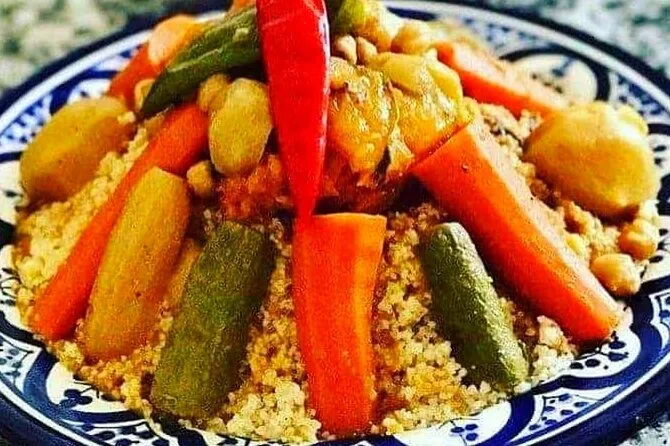 Una comida tradicional marroquí que incluye tagine y fruta fresca.