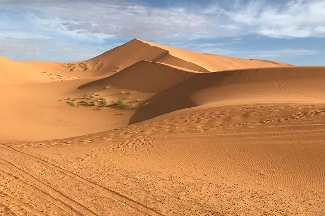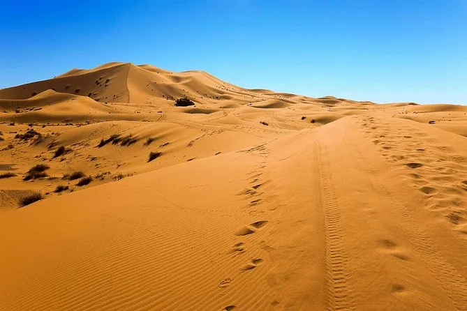Incluye transporte con aire acondicionado y guía/chofer de habla inglesa. Pasarás una noche en un campamento de lujo en el desierto (con cena y desayuno), otra en un hotel en el valle del Dades (también con cena y desayuno), además de paseos en camello por las dunas de Merzouga e incluso sandboard si te animas.
