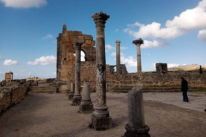 A la mañana siguiente, partimos hacia Rabat. La ciudad tiene amplios bulevares y palmeras, pero lo que más queda grabado son sus antiguas murallas. Nuestro guía nos llevó por las murallas almohades y andalusíes, compartiendo historias del pasado de la ciudad. La Torre Hassan está inacabada pero imponente, y el Mausoleo de Mohammed V es todo mármol blanco y respeto silencioso. De camino a Fez, hicimos una parada en Volubilis. Nunca pensé que las ruinas romanas estarían tan bien conservadas en Marruecos—los mosaicos brillaban bajo el sol y las cigüeñas anidaban en las columnas. Al atardecer, Fez apareció bajo nosotros, con sus tejados brillando en tonos naranjas. Después de cenar, un viejo cuentacuentos tejía relatos en un patio escondido de un riad; su voz se extendía por la cálida noche.