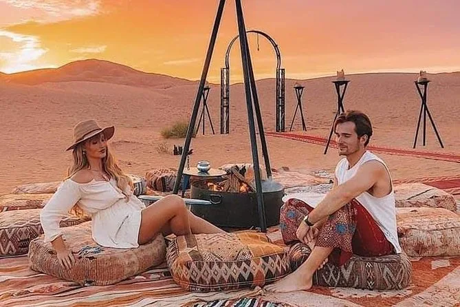 Al salir de Fez, cruzamos bosques de cedros cerca de Ifrane—monos cruzaban la carretera y el aire olía a pino fresco. En Midelt, paramos a tomar té de menta con vistas a picos nevados (¡incluso en primavera!). Ya por la tarde, las dunas de Merzouga se asomaban en el horizonte. La arena brilla dorada al atardecer. Nos recibieron con té dulce antes de subir a los camellos para un paseo tranquilo hacia el campamento. El silencio en el desierto es único—solo el viento y el suave paso de los camellos. La cena fue bajo una jaima nómada, con música y risas que resonaban bajo un cielo lleno de estrellas.