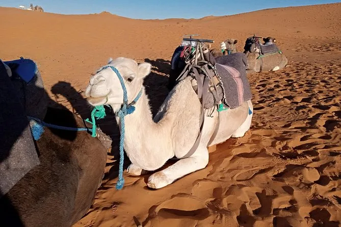 Este viaje incluye transporte privado en vehículos autorizados con aire acondicionado, todos los alojamientos en encantadores hoteles o riads marroquíes, visitas guiadas con expertos locales en cada ciudad, paseo en camello por el Sahara, la mayoría de los desayunos y cenas seleccionadas (incluyendo noches especiales bajo jaimas en el desierto), además de traslados al aeropuerto. El acceso para sillas de ruedas está disponible en todo el recorrido—solo avísanos tus necesidades para que todo sea cómodo para ti.