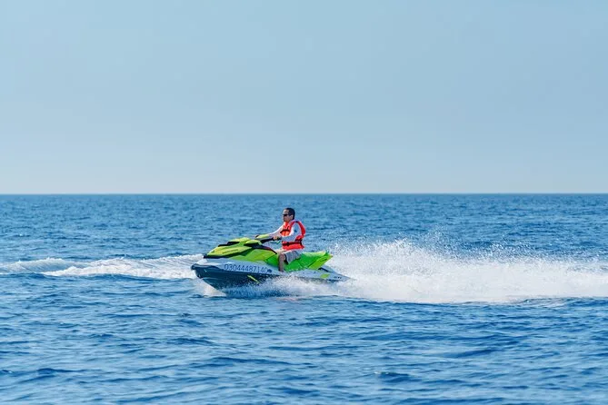 Tu día incluye traslado desde el hotel en van con aire acondicionado, todo el equipo de seguridad obligatorio incluyendo chalecos salvavidas, un jet ski doble para dos personas con guías locales expertos que mantienen contacto por radio a lo largo de la costa de Cabo, además de snacks frescos y bebidas frías al regresar a la marina antes del traslado de vuelta al hotel.