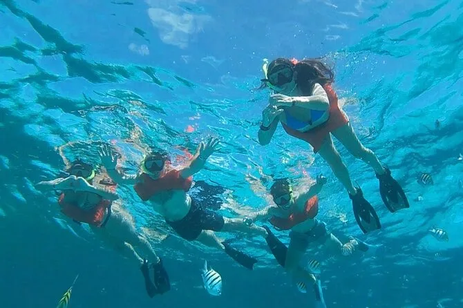 La tripulación es relajada pero atenta; siempre cerca sin ser invasiva. Cuando llegamos a mar abierto, alguien señala Isla Mujeres brillando a lo lejos. En nuestro alquiler de 4 horas sí podemos ir hasta allá — si solo reservas 2 horas, solo navegas por la bahía (que, honestamente, también se ve increíble). Anclamos cerca de Playa Norte y de repente todo se llena de colores: agua turquesa bajo nosotros, arena blanca a un lado, algunos pelícanos flotando como si fueran los dueños del lugar. El equipo de snorkel aparece casi como por arte de magia. No soy muy buen nadador, pero uno de los chicos me enseña a usar la máscara y se asegura de que esté bien antes de dejarme meter al agua. Agua salada por la nariz — clásico.