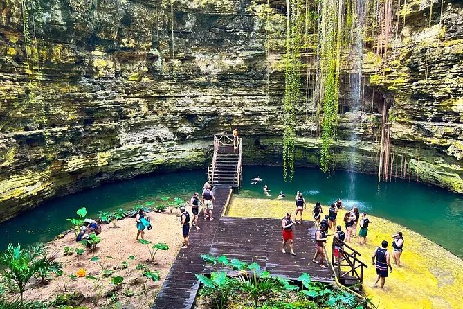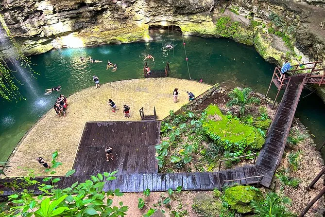 Tu día incluye traslado desde el hotel o punto de encuentro, entradas a Chichen Itzá (con impuestos incluidos si eliges Todo Incluido), tours guiados divididos por idioma, acceso para nadar en un cenote sagrado con instalaciones completas como baños y vestidores, almuerzo buffet mexicano con opciones vegetarianas (salvo si eliges estándar), degustación de tequila en el cenote, además de tiempo para pasear por la plaza principal de Valladolid y las ruinas antes de regresar cansado y probablemente aún mojado de la natación.