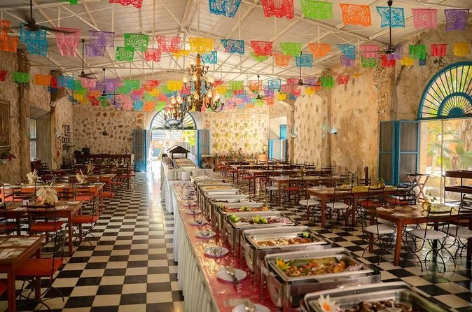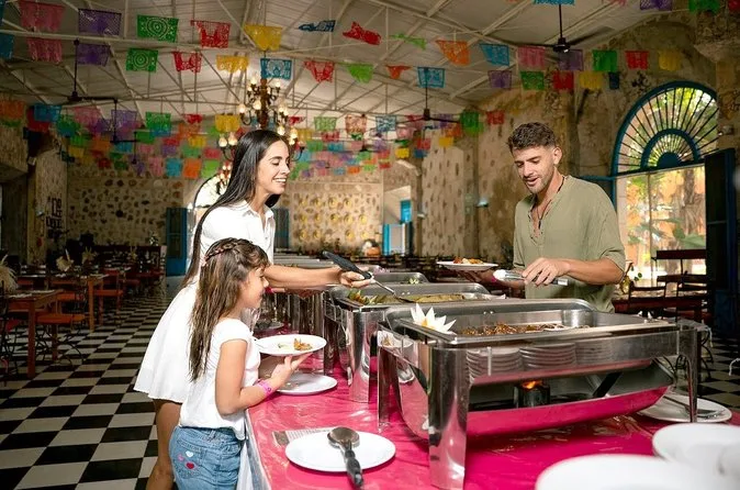 El buffet incluye platos tradicionales de Yucatán como pollo en salsa de naranja, lomo en salsa maya, pescado a la parrilla, ensaladas, arroz con frijoles, fruta fresca, postres y café o té.
