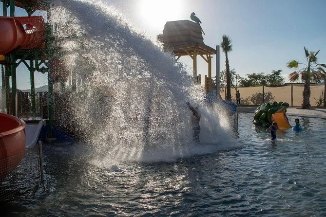 Tu día incluye entrada a Wild Canyon con paseo en camello guiado por el oasis El Tule, visita al santuario con guacamayos y tortugas, agua ilimitada para rellenar (lleva tu botella), quesadillas de queso, chips con salsa y bebida a elegir entre smoothie o cóctel con tequila, todo antes de relajarte junto a la piscina o probar los toboganes en el restaurante Lion’s Den.