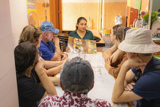 Disfrutarás un tejate en el bullicioso Mercado Benito Juárez, crujirás chapulines con locales cerca, verás tamales chisporrotear en comales calientes y compartirás historias mientras comes tlayudas ahumadas. Cada paso trae nuevos sabores y risas — no es solo comer, es vivir Oaxaca por unas horas.