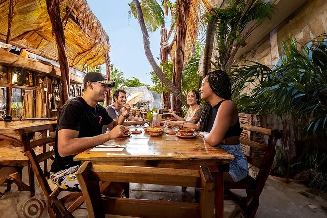 Después llegamos al mismo Puerto Morelos, cascos fuera y el pelo al viento. Tiene ese aire tranquilo de pueblo pesquero; gente charlando fuera de las tiendas, perros callejeros dormitando a la sombra. Probamos algunos snacks locales (aún no sé qué eran la mitad) y paseamos junto a paredes pintadas y viejos barcos en la orilla. Hubo tiempo para curiosear o simplemente sentarse con una bebida fría antes de regresar—la verdad, me habría quedado más tiempo solo viendo la vida pasar.