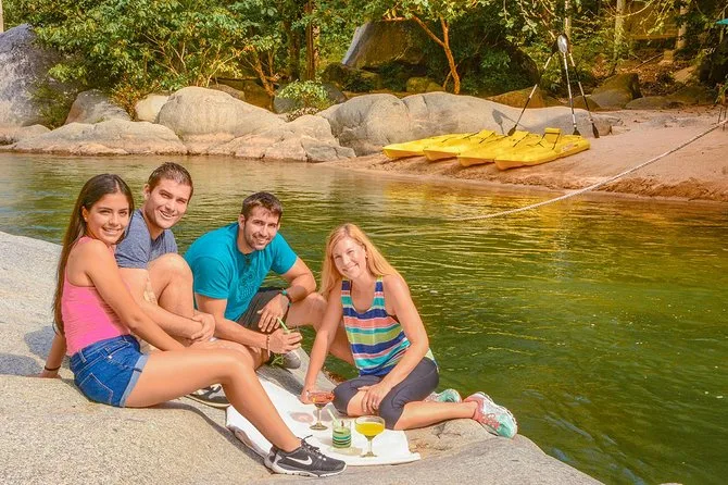 Tu día incluye transporte ida y vuelta desde Puerto Vallarta en lancha rápida o camioneta por la selva (tú eliges), las 19 tirolesas con equipo de seguridad y guías bilingües que te acompañan en todo momento. Después podrás nadar o hacer kayak en pozas naturales antes de disfrutar un almuerzo completo junto al río con bebidas tropicales y una degustación tradicional de tequila—todo listo antes de regresar a la ciudad.
