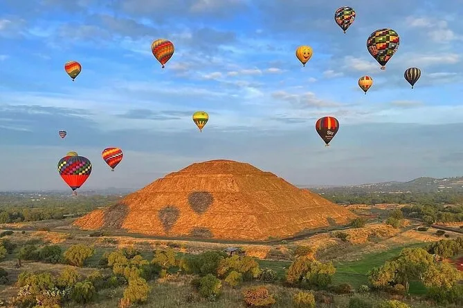 Tu día incluye recogida temprano en tu hotel de Ciudad de México, café y galletas al llegar al campo de globos de Teotihuacan, vuelo en globo al amanecer con piloto experimentado, brindis y certificado al aterrizar, desayuno en un restaurante dentro de una cueva volcánica exclusivo para este tour, taller guiado de obsidiana y maguey con degustación de bebidas, más tiempo libre para recorrer la zona arqueológica antes del regreso a tu hotel.