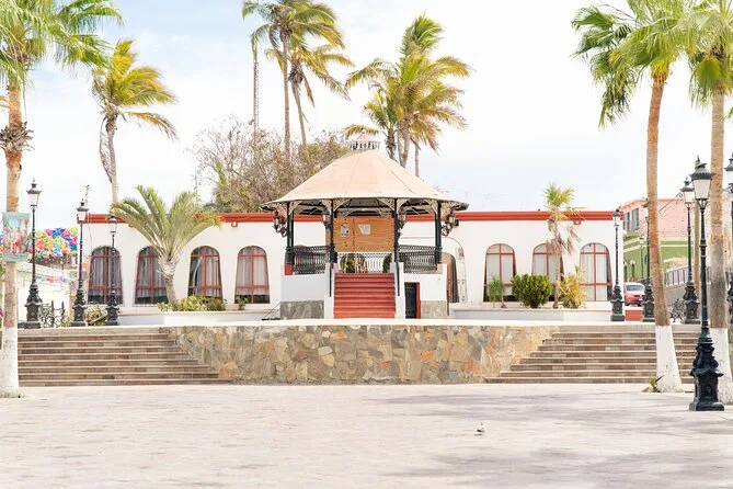 Visitarás la antigua Misión Jesuita (Iglesia de Nuestra Señora del Pilar), el Teatro Márquez de León, galerías de arte, una fábrica de mantas mexicanas y una demostración de perlas.