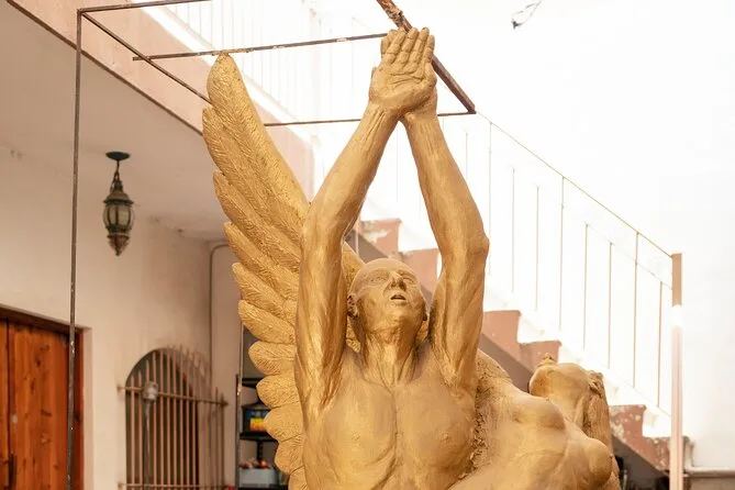 La antigua misión jesuita está justo en el centro del pueblo. Jorge señaló unas marcas de bala en la pared de la iglesia (yo no las había notado hasta que me lo dijo), y luego nos acercamos al Teatro Márquez de León. No es nada grandioso, pero tiene una elegancia gastada—la pintura se está cayendo en algunos lados, pero la gente sigue reuniéndose afuera como si importara. El paseo de arte fue más pausado de lo que imaginaba; me paraba en cada vitrina porque las pinturas se sentían diferentes a las que ves en casa—más luz desértica, menos pulido. Había una escultura que parecía madera arrastrada por el viento—todavía me acuerdo de esa pieza.