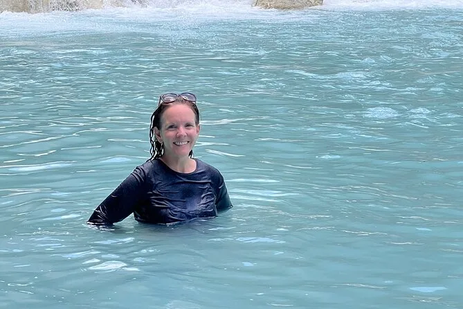 Después de un par de horas entre piscinas (tratando de no dejar caer el teléfono mientras tomaba fotos), bajamos hacia la zona de las grutas. Hay un túnel por donde caminas con agua cayendo sobre los hombros, y de repente estás dentro de una cueva iluminada por una luz azul que entra desde afuera. Es ruidoso por los ecos y el agua corriendo, pero también tiene algo de paz, difícil de explicar si no lo vives. El almuerzo fue sencillo: tacos en uno de los restaurantes al aire libre junto al río, nada sofisticado pero justo lo que necesitaba después de tanto rato en el agua. Aún recuerdo lo tranquilo que estaba todo justo antes de irnos—el único sonido era el constante correr del agua y alguna risa a lo lejos río arriba.