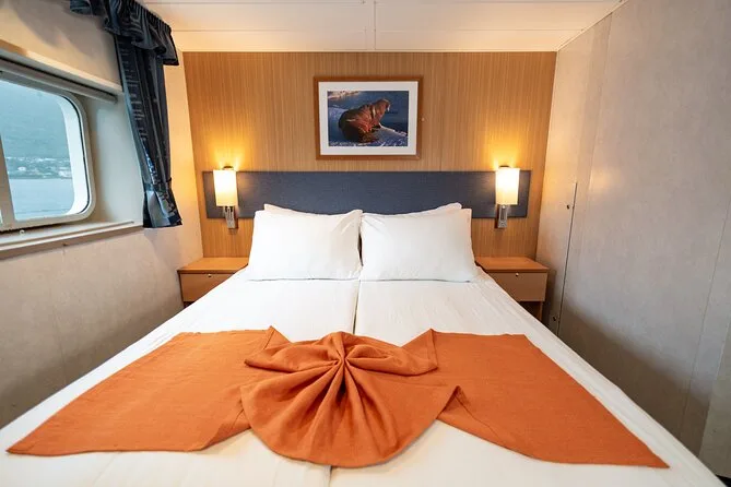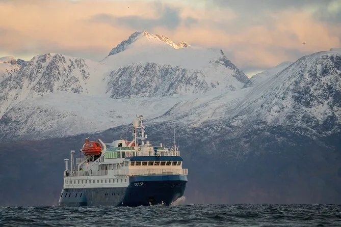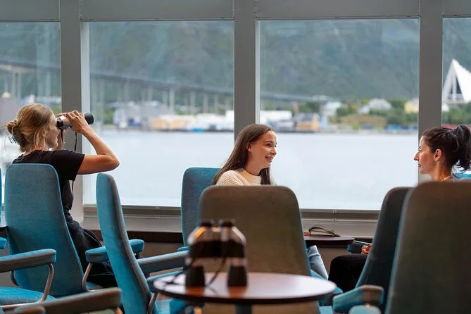 Tu viaje incluye crucero ida y vuelta desde Tromsø con todas las comidas: cena en restaurante ártico, desayuno y almuerzo, además de café, té y snacks durante el día. Tendrás una cabina con vista al mar para pasar la noche, traje térmico de flotación para estar cómodo en cubierta, persecución guiada de auroras con charlas expertas en el salón panorámico, avistamiento de ballenas con guías profesionales que te contarán sobre la vida marina antes de regresar al puerto.