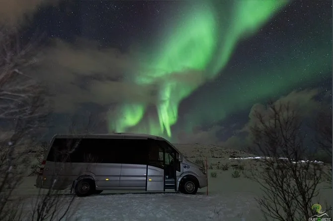 Tu noche incluye recogida en el centro de Tromsø, transporte ida y vuelta al corazón del Ártico con WiFi a bordo, traje térmico para que no pases frío, ayuda de un fotógrafo profesional con trípodes, bebidas calientes y snacks junto a una fogata en la nieve, además de copias digitales de tus mejores momentos bajo las auroras enviadas a tu correo, y regreso a tu hotel tarde en la noche.