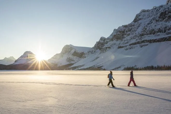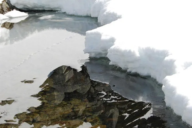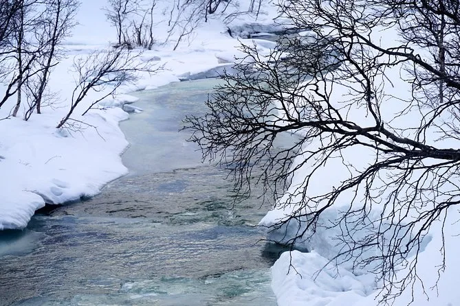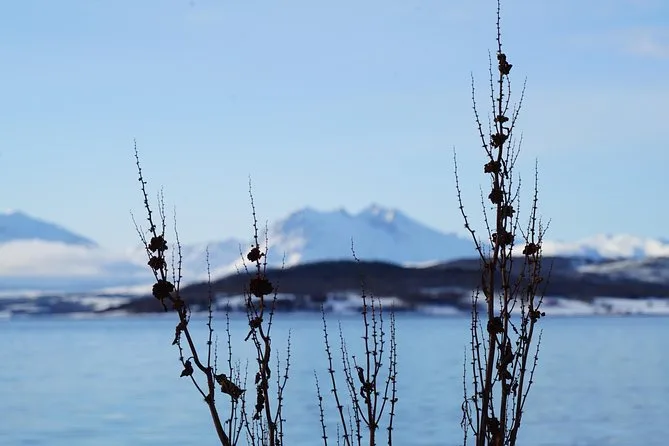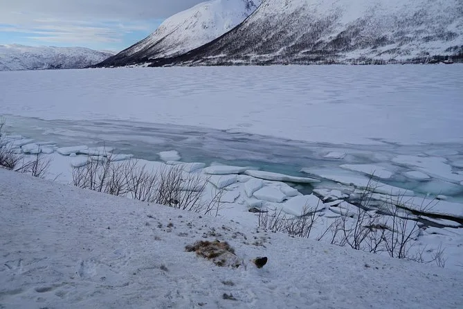 Luego nos dirigimos rápido hacia la playa Telegrafbukta. El viento cortaba fuerte desde el fiordo, pero la vista — montañas en capas de azul grisáceo y blanco — me hizo olvidar el frío en los pies por un momento. Caminamos sobre nieve crujiente (casi resbalo; Erik se rió pero me ofreció su brazo) y me señaló dónde la gente nada en verano. Difícil imaginarlo ahora con todo congelado. Después subimos al lago Prestvannet, en el centro de la isla de Tromso — solo pájaros y ese silencio suave que solo la nieve puede traer. Tiene una paz extraña.