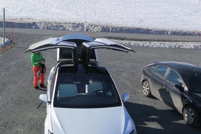 Se utiliza un Tesla Model X ecológico con ventanas panorámicas.