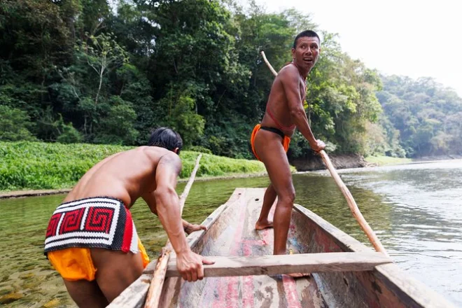 El primer paseo en canoa río arriba dura unos 30 minutos; luego hay otro de 15 minutos para llegar a la comunidad.