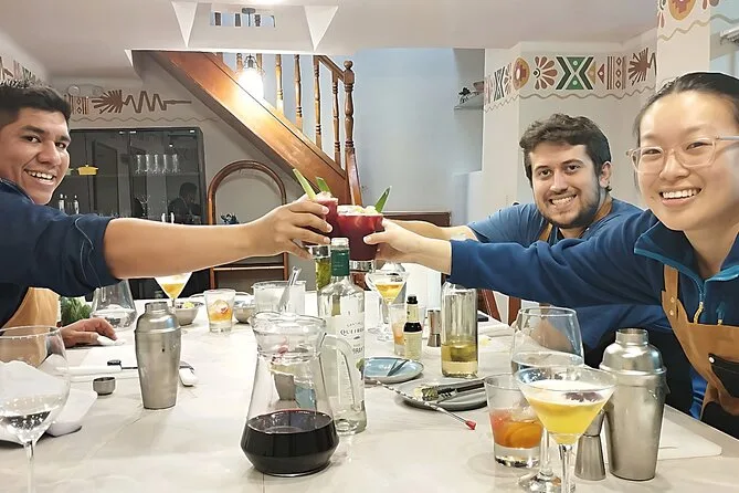 Después de recorrer el mercado (y de intentar mi español con una abuela que vendía hierbas), caminamos unos diez minutos hasta su estudio de cocina—una casona antigua de los años 30 con persianas azules y ese olor a leña que se queda en las paredes. Nos lavamos las manos, nos pusimos el delantal y nos metimos de lleno en la preparación de cócteles. Primero un pisco sour—mis habilidades exprimiendo limón necesitan práctica, claramente—y luego preparamos uno con maracuyá fresco del mercado. La cocina se llenó de risas; alguien derramó pisco y todos nos reímos más de lo que deberíamos.