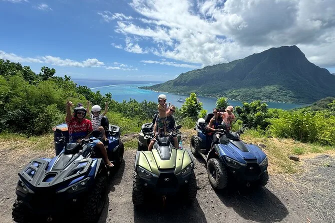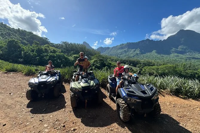 Tu día incluye paseos guiados en jet ski por Cook's Bay y Opunohu's Bay con paradas para nadar entre rayas y tiburones (si te animas), además de una aventura en ATV por campos de piña pasando por una escuela agrícola hasta Magic Mountain — todo con un guía local que comparte historias en el camino.