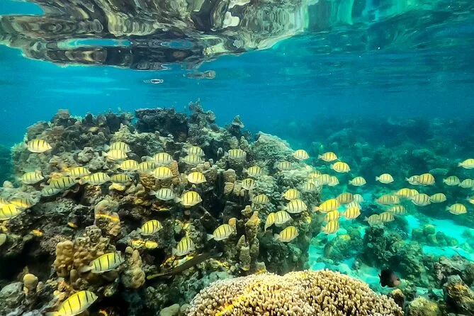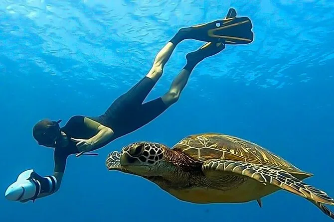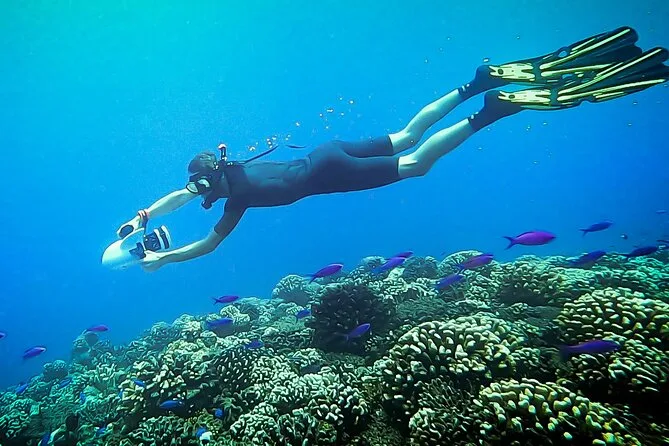Deslízate por la laguna de Tahiti en sea scooter con un guía local, explorando jardines de coral, naufragios y avistando tortugas o mantarrayas de cerca. Grupos pequeños para más espacio y risas con tus torpezas en el snorkel. Incluye snacks, fotos, equipo completo y esos momentos únicos que no se planean.