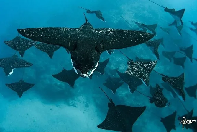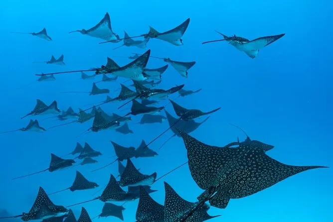 Podrás ver tortugas, mantarrayas (águila y leopardo), tiburones, barracudas, delfines y varios peces de arrecife.
