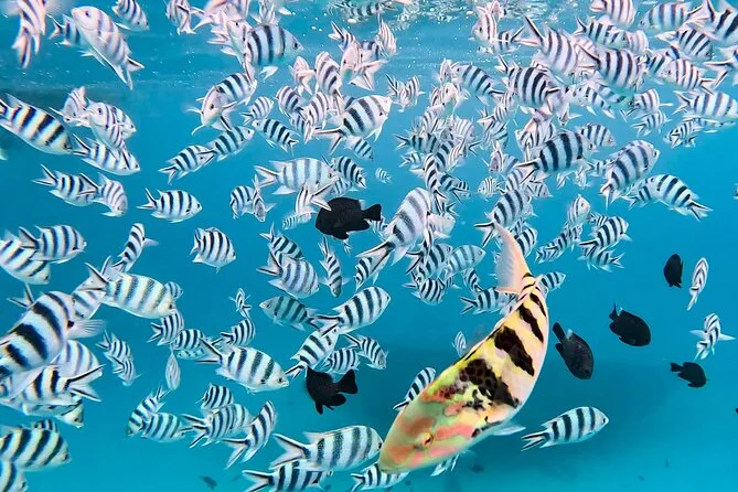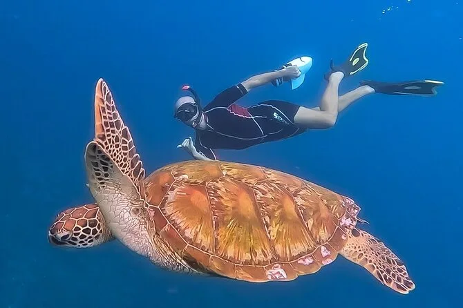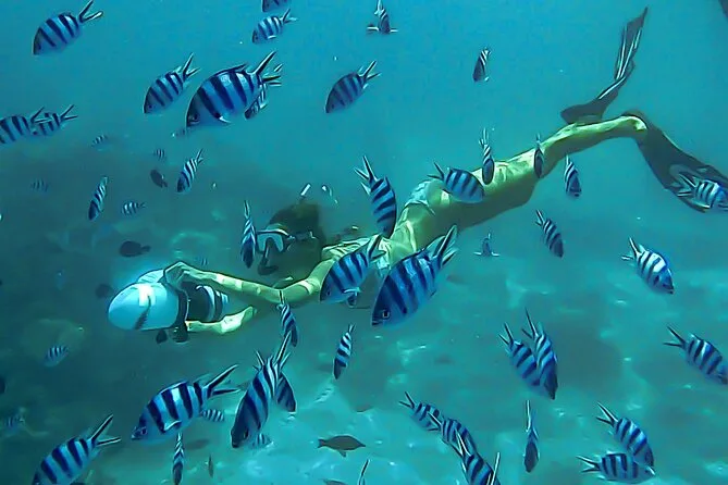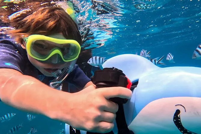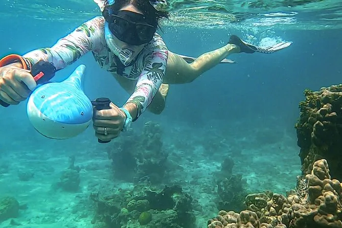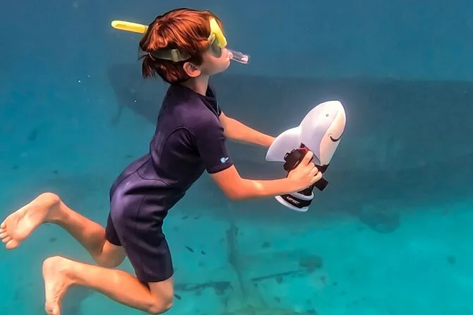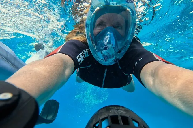 Tu día incluye el uso de un sea scooter y equipo completo de snorkel (aletas, máscara, tubo, traje), guía local profesional en cada sitio, además de agua embotellada, jugo, café o té y snacks a bordo—con fotos y videos capturados durante la aventura antes de regresar a la orilla.