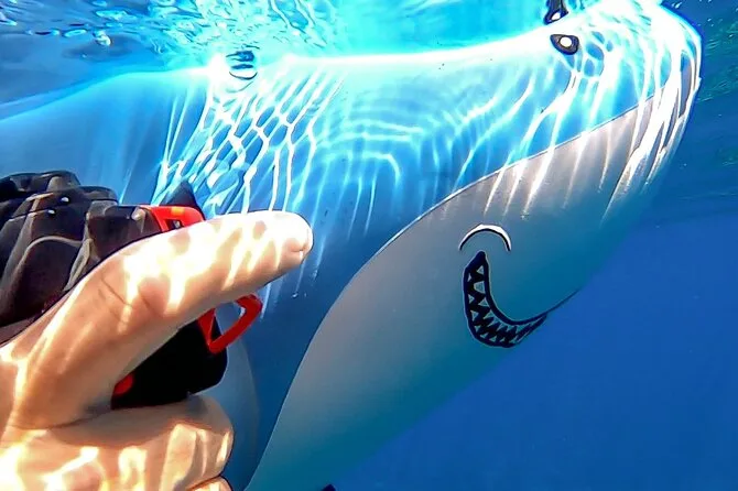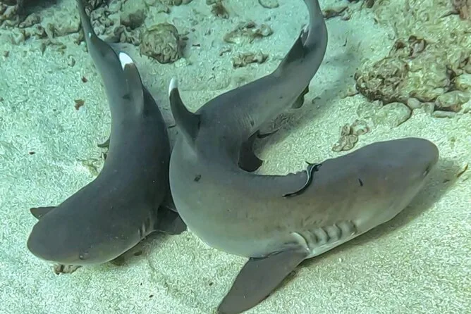 Confieso que tenía algo de miedo a los tiburones (¿quién no?), pero Manu los describía como si fueran parte del día a día — “solo son curiosos,” se encogió de hombros. En el Valle Blanco flotamos sobre un paso arenoso y ahí estaban: siluetas elegantes deslizándose bajo el agua, ignorándonos por completo. El scooter hacía que fuera sorprendentemente fácil seguirles el ritmo; casi ni tuve que patear. En un momento, una tortuga pasó tan cerca que pude ver el alga en su caparazón. El agua sabía un poco a metal cuando me reí y tragué sin querer — nada glamuroso, pero real.