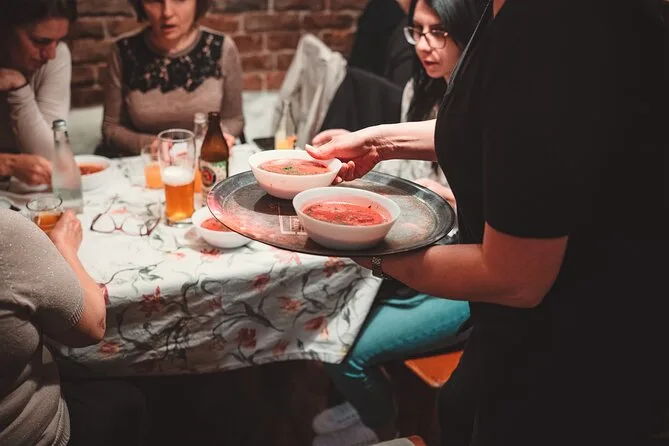 Tu tarde incluye paseos guiados por el Casco Antiguo y Kazimierz con un guía en inglés que comparte historias; degustaciones de 13-14 platos tradicionales polacos; además de vodka local y cerveza artesanal servidos en paradas para sentarse antes de terminar en el centro de Cracovia.