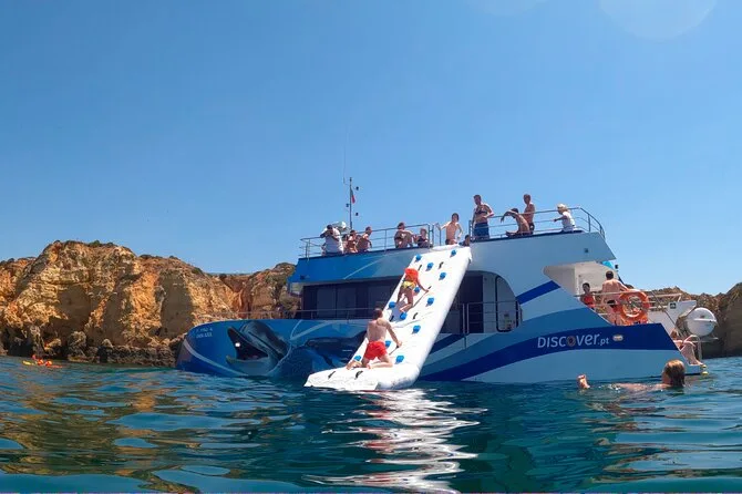 Saldrás de Lagos en un catamarán con asientos acolchados y sombra, guiado por locales que conocen cada rincón de los acantilados de Ponta da Piedade. Verás delfines nadando cerca (o te darán un voucher gratis si no aparecen), probarás actividades acuáticas divertidas y disfrutarás de snacks mientras la brisa marina te acompaña. Momentos que se quedan contigo mucho después de volver a tierra.