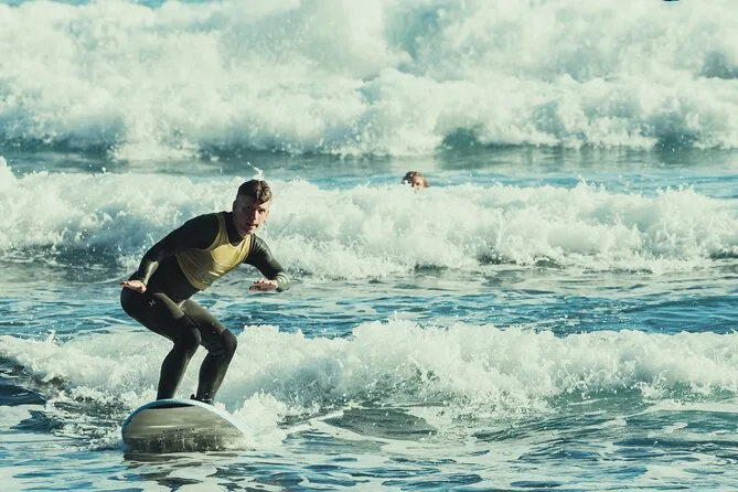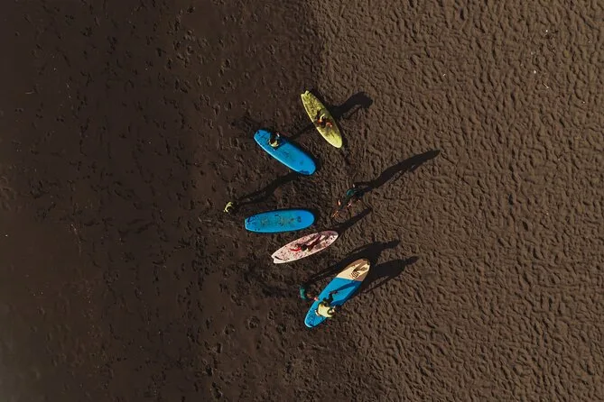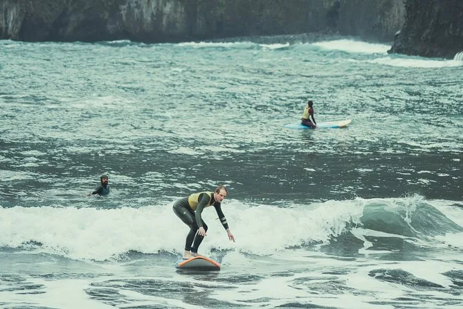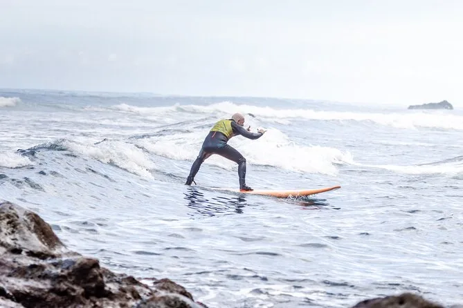 Tu día incluye todo el equipo de surf—traje de neopreno y tabla—y la guía de instructores locales que eligen los mejores lugares según las condiciones del día. Harás un calentamiento completo en la arena volcánica antes de lanzarte a olas suaves; aprenderás reglas de seguridad, técnicas de remo, cómo levantarte en la tabla, coger olas y estirar al final, para volver cansado pero feliz.