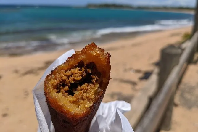 El camino hacia Piñones se volvió más animado—música saliendo por las ventanas abiertas, olores a playa mezclados con plátanos fritos. El almuerzo no estaba incluido, pero Marta sabía exactamente dónde parar; ella pidió por nosotros en español porque me quedé en blanco (Li se rió cuando intenté decir “alcapurria”—la verdad la arruiné). Comiendo a la orilla de la carretera con arena pegada en las piernas, me di cuenta de cuánto forma parte la comida de este lugar. Pasamos por playas como Pozita de Piñones y Vacia Talega—los locales nos saludaban al pasar. No parecía un tour, sino como acompañar a alguien que realmente vive aquí.