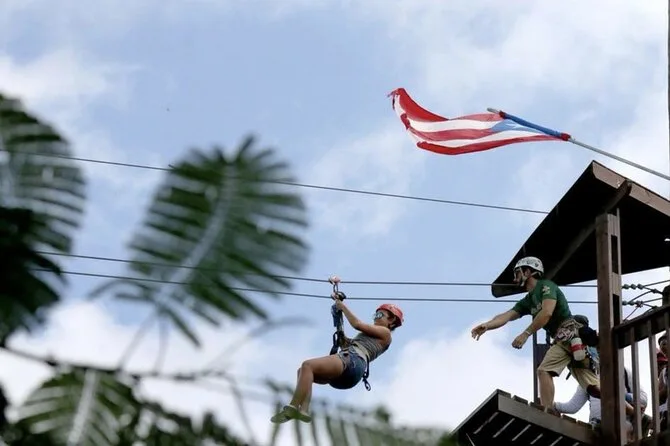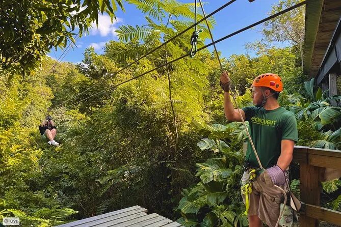 Camina por un bosque frondoso cerca de San Juan con guías locales antes de volar por cinco tirolesas—incluyendo una épica de 300 metros—y cruzar puentes colgantes altos entre los árboles. La aventura termina en un bar de mojitos en la cima donde todos se relajan juntos. Prepárate para risas, rodillas temblorosas y vistas que no olvidarás.