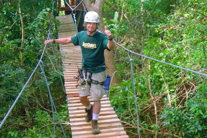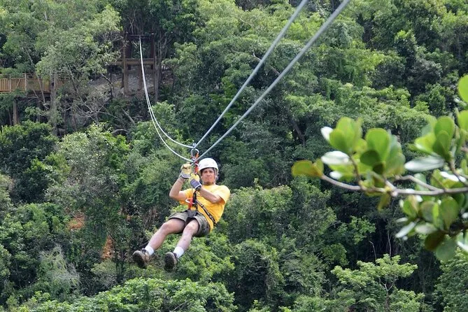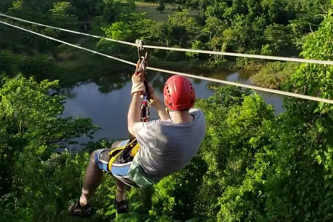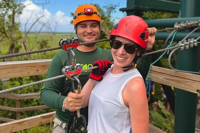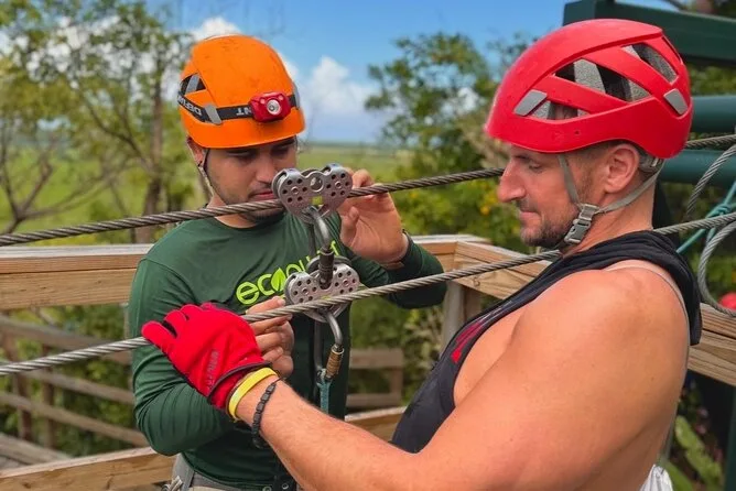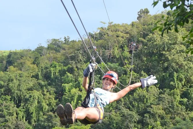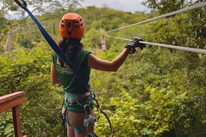 Tu medio día incluye todo el equipo de seguridad—casco, arnés, guantes—una explicación completa de guías locales certificados que te acompañan en cada tirolesa y puente. Terminas en el bar de mojitos donde puedes comprar bebidas o snacks antes de regresar a San Juan por tu cuenta.