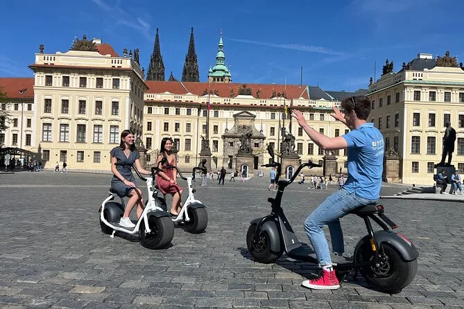 Tu día incluye recogida en taxi desde cualquier punto de Praga para que no tengas que preocuparte por llegar. Te proporcionan todo el equipo necesario: casco, y si hace falta, chubasquero o guantes según el clima. El tour combina paseos en Segway y patinete eléctrico con un guía local amable (varias opciones de idioma). También te dan una botella de agua para mantenerte hidratado entre paradas — y si quieres fotos durante el recorrido, solo pídelo al guía; estarán encantados de ayudarte.