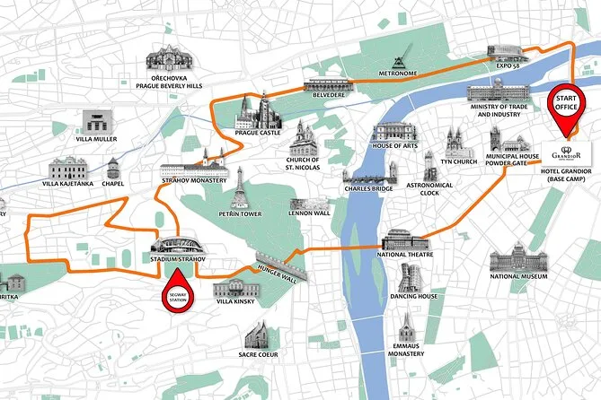 Verás el Castillo de Praga, zona del Monasterio de Strahov, vistas desde la Torre de Petrin, Muro de John Lennon, Puente de Carlos, Museo Franz Kafka, Rudolfinum y más.