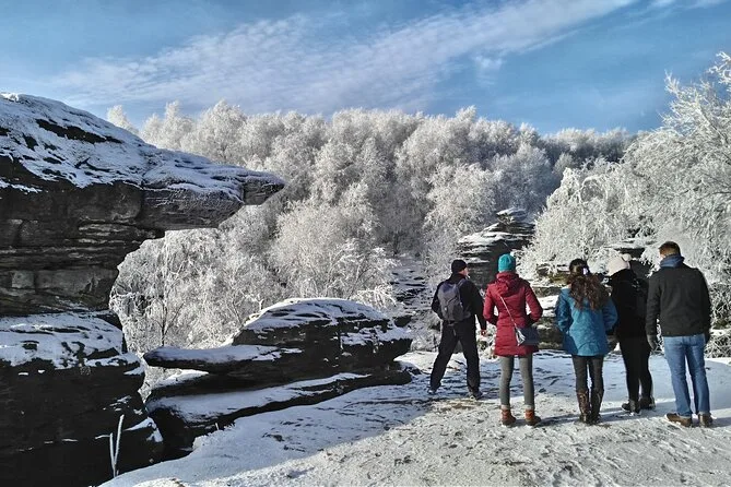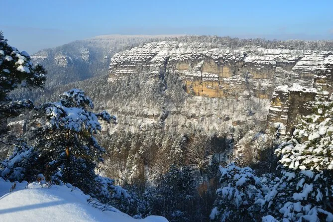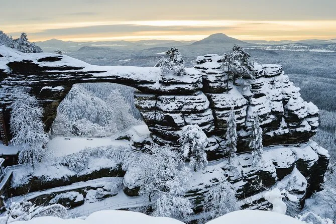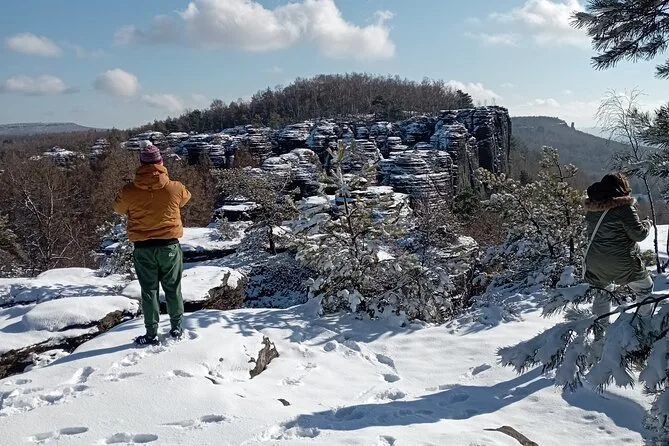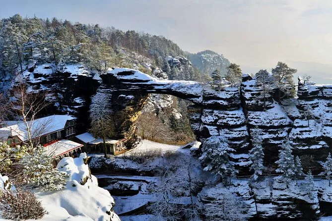 Camina por senderos nevados junto a torres de arenisca en el Parque Nacional Suiza Bohemia, llega a Pravcicka Gate sin multitudes, comparte historias durante la comida en U Forta y cruza el Puente Bastei sobre el cañón del Elba con un guía local. Una excursión desde Praga llena de momentos tranquilos y paisajes salvajes que recordarás mucho después de que la nieve se derrita.