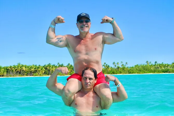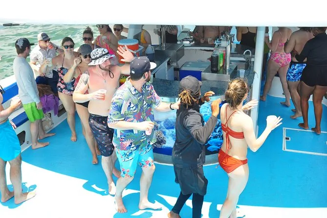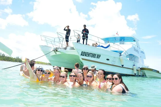 Tu día incluye transporte privado desde tu hotel o resort en zonas como Bávaro o Cap Cana; barra libre con bebidas ilimitadas; nachos con salsa y fruta fresca; uso del equipo de snorkel para explorar el arrecife; dos toboganes desde el catamarán; además de música y un animado show de baile con la tripulación local antes de regresar a tu hotel.
