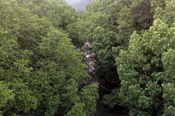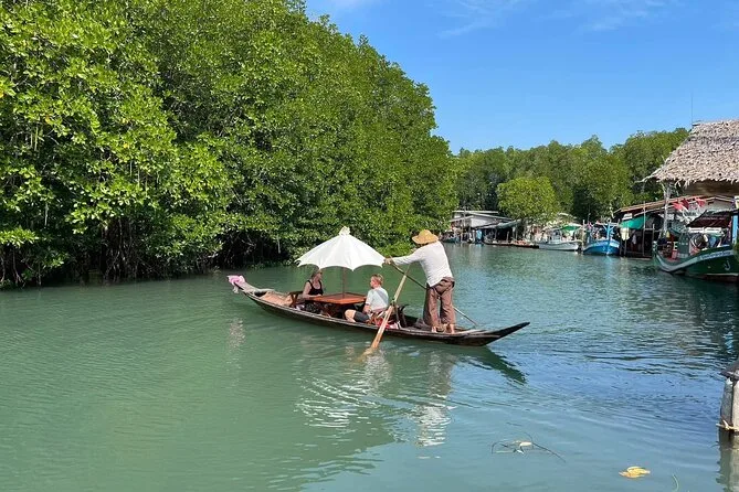 Tu día incluye recogida y regreso al hotel en vehículo con aire acondicionado, visitas guiadas al mirador de White Sand Beach y al santuario Chao Po Koh Chang, elección entre barco tradicional o kayak para recorrer los manglares de Salak Kok con guía local que te explica todo, entrada al templo Wat Salak Phet, almuerzo en restaurante local de Salak Phet, agua embotellada durante el trayecto y una bebida congelada para relajarte en Shambala Beach Bar antes de regresar por la tarde.