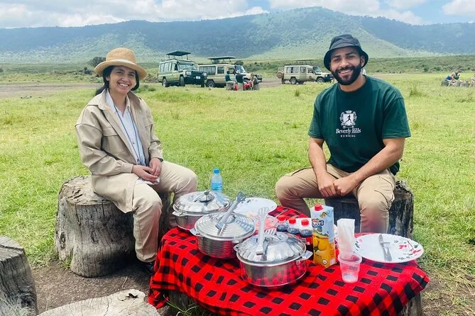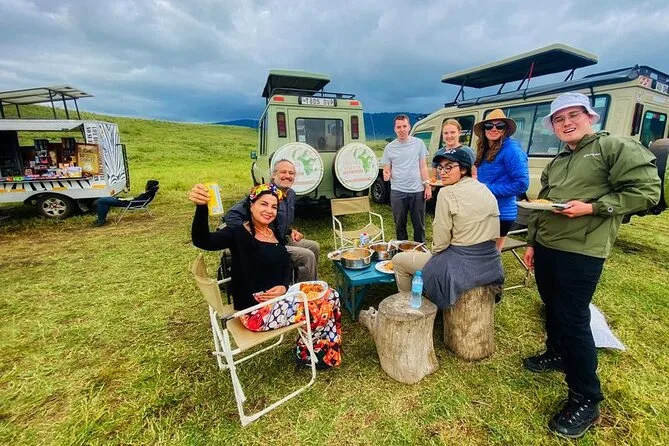 Tu día incluye recogida en Arusha por tu guía y conductor, entrada al Área de Conservación de Ngorongoro, transporte en vehículo safari con agua y refrescos. El almuerzo tipo picnic se sirve junto a un charco de hipopótamos dentro del cráter (con café o té), y pueden atender solicitudes dietéticas si las comunicas antes de regresar a la ciudad por la tarde.