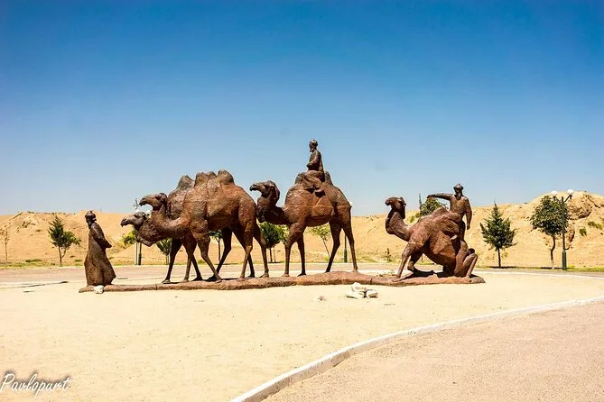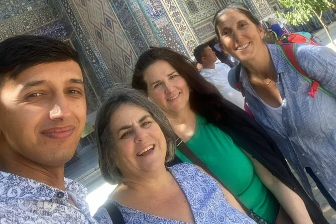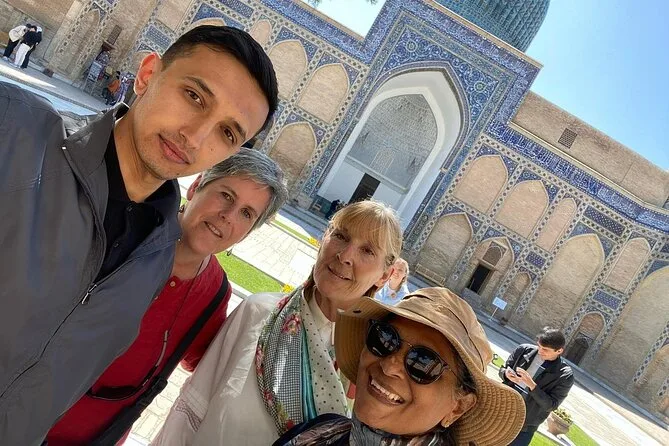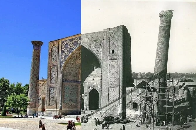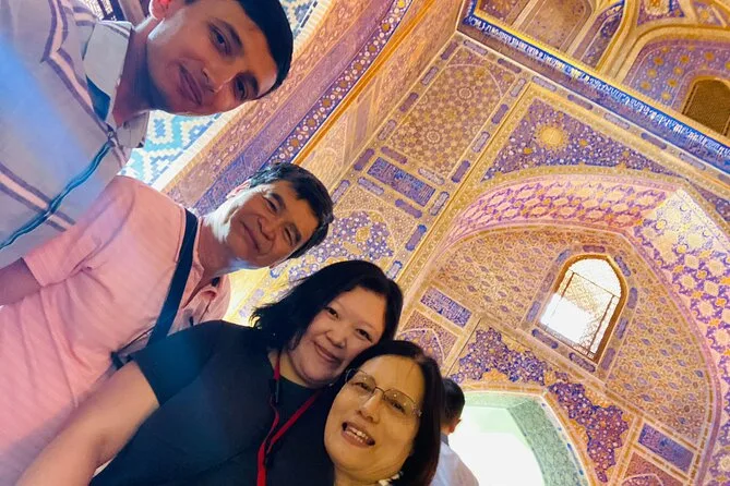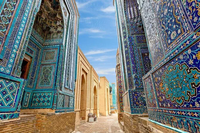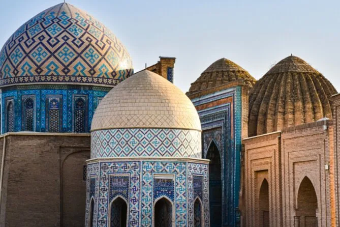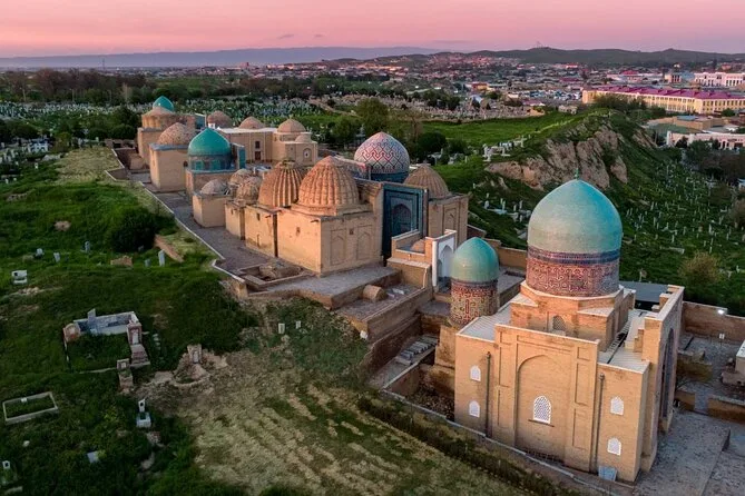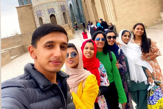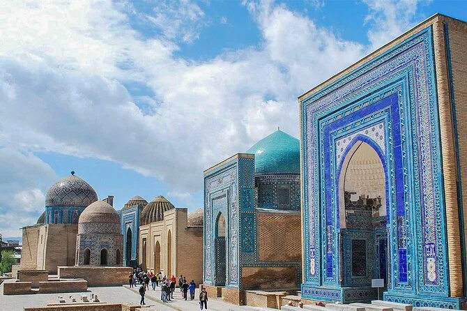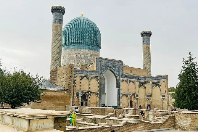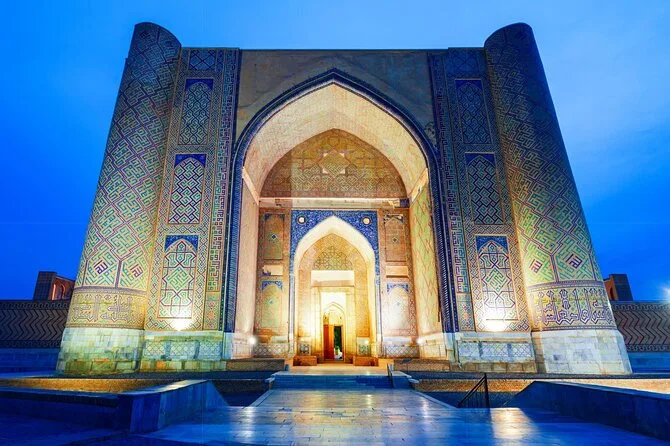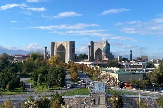 El tour incluye la plaza Registán, el mausoleo Gur-e-Emir (interior), la mezquita Bibi-Khanym (exterior), la mezquita Hazrat Khizr (interior) y la necrópolis Shah-i-Zinda (exterior).