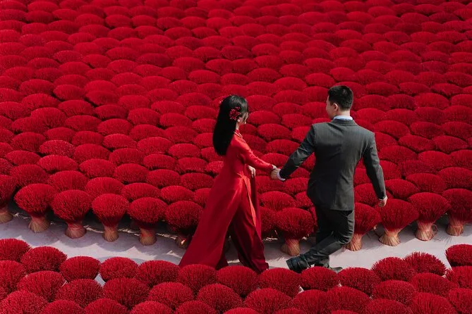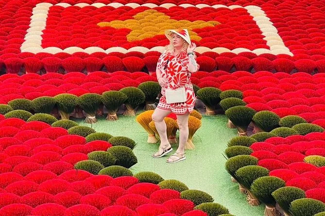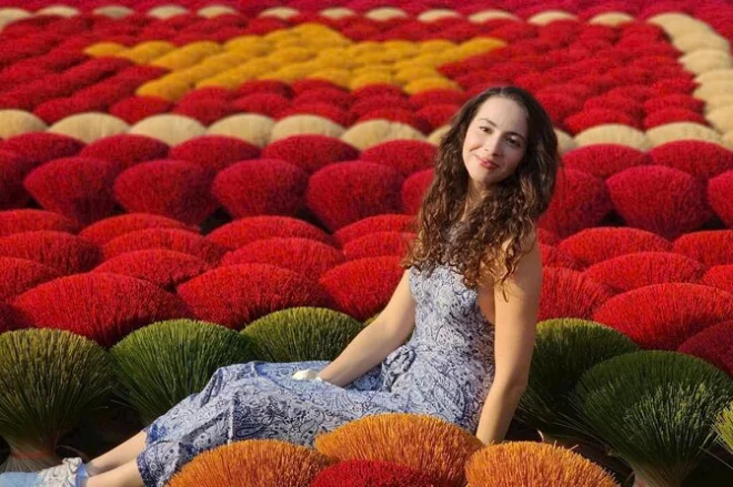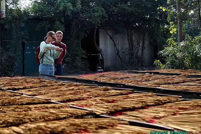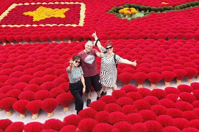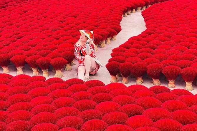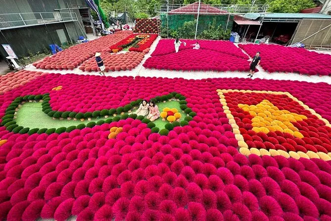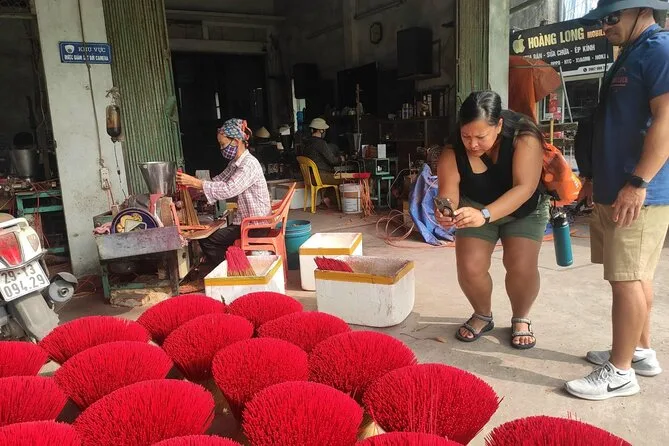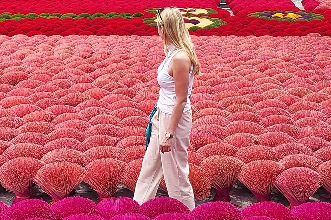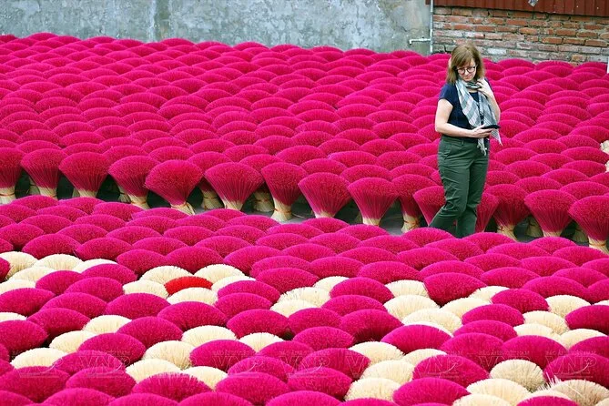 Lo primero que me llamó la atención fue el aroma: dulce, ahumado, casi como canela pero con un toque más intenso. Apenas salimos de la furgoneta en Quang Phu Cau, el aire cambió por completo. Nuestra guía, Linh, sonrió y nos llamó hacia unos manojos de varitas de incienso rojo secándose al sol. El color era tan vibrante que casi me dolían los ojos. Intenté preguntarle a una de las mujeres cuánto tiempo llevaba haciendo incienso (Linh se rió cuando intenté decirlo en mandarín, seguro que lo dije fatal), y ella solo sonrió y señaló sus manos, manchadas de rosa por años de trabajo. Había algo reconfortante en ese ritmo: mojar, enrollar, golpear. Era como ver a alguien tejer, pero con una paciencia diferente.