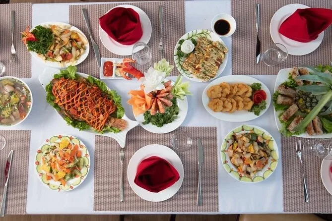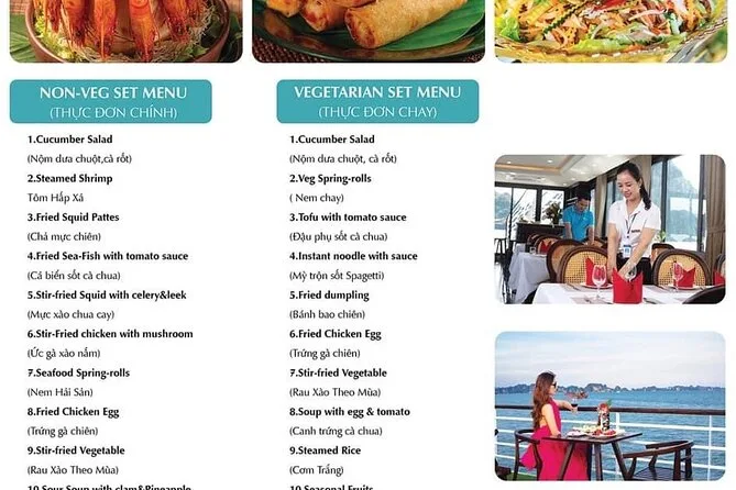 Sí, se sirve un almuerzo tradicional vietnamita de mariscos a bordo; hay opciones vegetarianas si las pides.